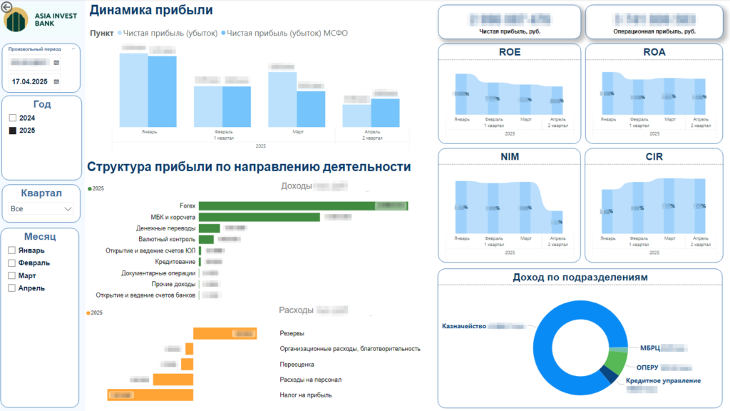 • Финансовые результаты: чистая прибыль, структура доходов и расходов (процентные, комиссионные, валютные), рентабельность активов и капитала