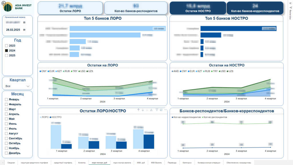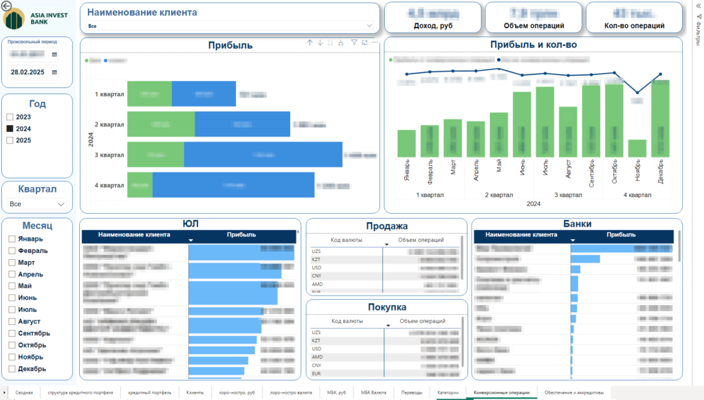 • Клиентская аналитика: динамика клиентской базы (ФЛ/ЮЛ, резидент/нерезидент), рейтинги ТОП-10 клиентов по обязательствам